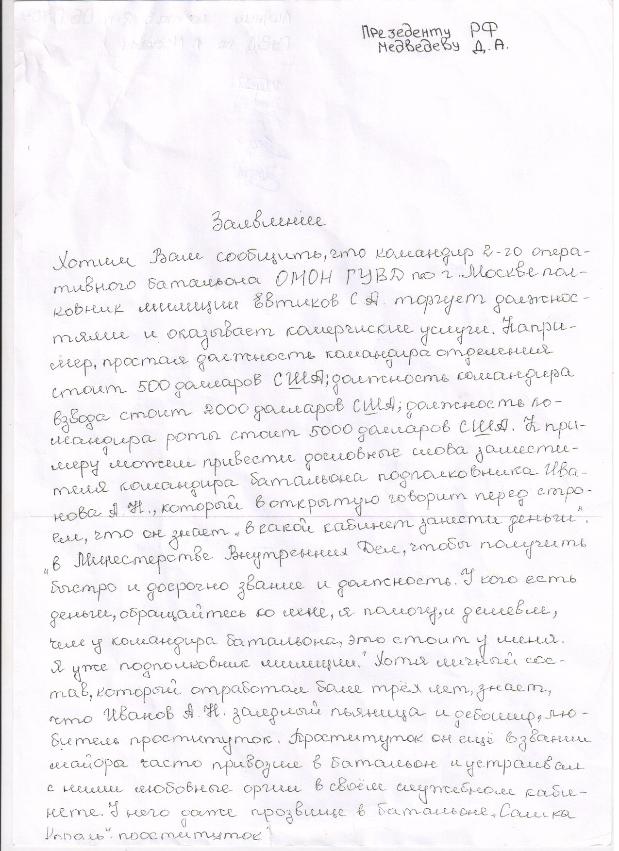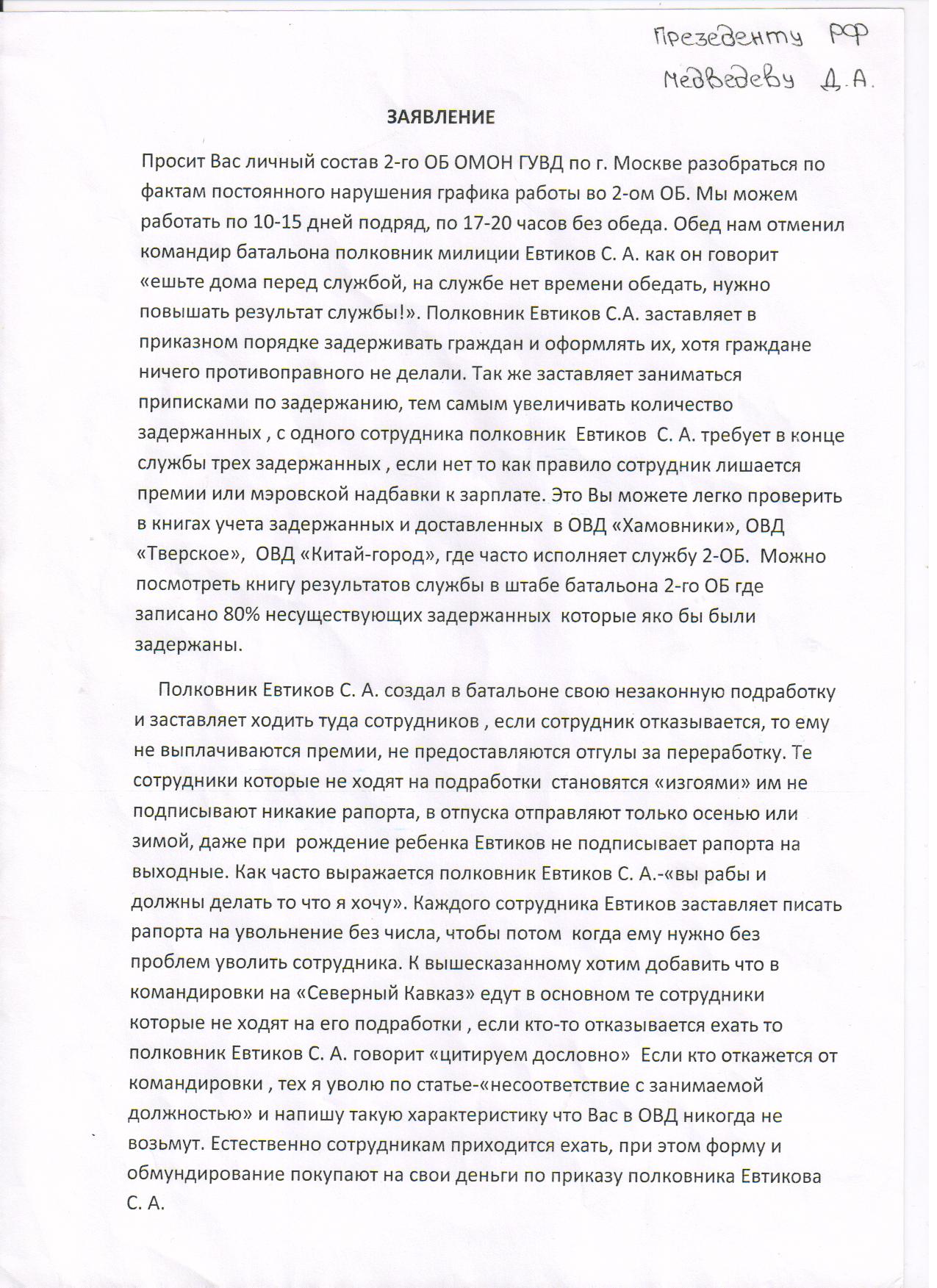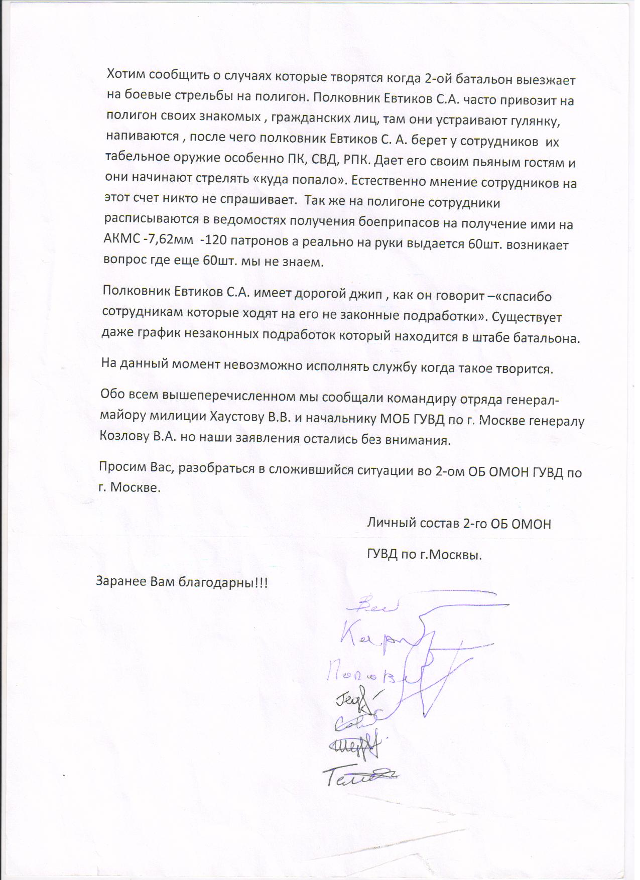 Дата04.02.2010АвторСкрытИсточникNew TimesСохранённая копияInternet ArchiveOriginal MaterialShow translationВ пресс-центре ГУВД сотрудники ОМОНа заявили, что не подписывали писем президенту Медведеву.Вот эти письма и эти подписи: