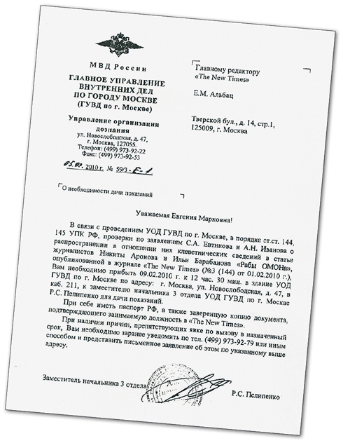 P.S. За несколько часов до того, как этот номер ушел в типографию, в редакцию поступило факсимильное уведомление ( см. выше) о том, что Следственное управление ГУВД Москвы вызывает журналистов The New Times для дачи объяснений.