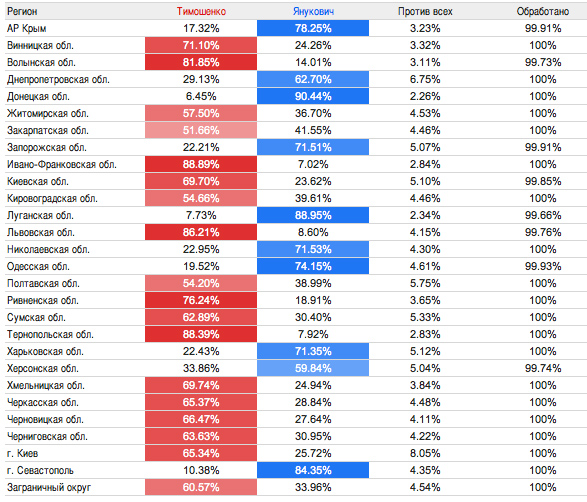 Дата10.02.2010АвторСкрытИсточникNew TimesСохранённая копияInternet ArchiveOriginal MaterialShow translationРезультаты выборов на Украине 2010Обработано 100% бюллетеней Голосование в регионах Источник: Украинская правда