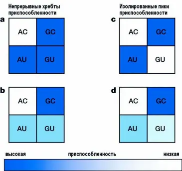 В работе [1] исследователей из Центра геномной регуляции в Барселоне, Испания и Университета Мичигана, США изучалась эволюция митохондриальной транспортной РНК. Они рассмотрели переключения между Уотсон-Криковскими парами AU и GC (см. рис. 1) и показали, что промежуточные варианты GU и AC связаны с уменьшением приспособленности. Полученные для межвидовой и внутривидовой вариации результаты находятся в соответствии с гипотезой Кимуры о компенсаторной эволюции. Подобные компенсаторные переключения, из AU в GC, или наоборот, составляют основную долю от всех замен во вторичный структурах мт-тРНК, что показывает, что эти молекулы эволюционирует не шаг за шагом, как предсказывает классическая теория, а почти одновременной фиксацией двух отдельных мутаций. Исследователи говорят, что «Несмотря на наглядность пошаговой модели адаптивной эволюции, кажется, что для мт-тРНК большинство замен зависят от популяционной динамики, позволяющей перепрыгивать к лучшей приспособленности».