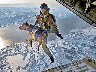 Использование собак-парашютистов было впервые опробовано американскими отрядами Delta. Они приучили животных во время прыжка дышать через кислородные маски. Позже британская Специальная авиационная служба (SAS) переняла эти методы и приобрела несколько натренированных в Америке собак для использования в Афганистане и Ираке.