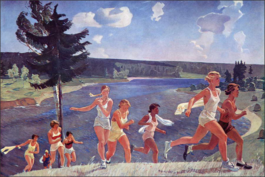 – Я думаю, что Дейнека был человек очень искренний и прямой, он не привык кривить душой. "Ост" существовал до конца 1920-х годов, но при этом Дейнека старался отразить не парады и демонстрации, которых, кстати, во второй половине 20-х годов было не так уж и много, но отразить какую-то такую позитивную сторону жизни. Это тоже было отражением действительности в какой-то мере: спорт, индустриализация… Мне кажется, Дейнека и его товарищи, ставя такую задачу, вполне осознанно стремились найти позитивное начало в окружающей жизни. И потом, они все-таки действительно были достаточно искренне убежденными энтузиастами в тот период.