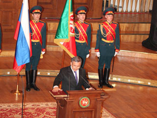 Церемония инаугурации нового президента Татарстана Рустама Минниханова прошла в Казани в четверг в Большом концертном зале имени Салиха Сайдашева. Президент Медведев 27 января внес на рассмотрение парламента республики кандидатуру премьер-министра республики Минниханова, и 4 февраля депутаты единогласно наделили его полномочиями президента республики.