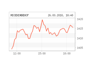 По итогам торгов в пятницу индекс ММВБ вырос до 1415,54 пункта (+0,63%), индекс РТС - до 1519,87 пункта (+0,32%), цены большинства основных "фишек" выросли на биржах на 0,1-3,6%.