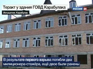 Два взрыва произошли в понедельник в Ингушетии у здания ГОВД города Карабулака. В результате первого погибли два милиционера. Во время второго взрыва никто не погиб. Четыре человека ранены. Не исключается возможность третьего теракта. Правоохранительные органы Ингушетии переведены на усиленный вариант несения службы.