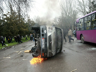 Напомним, массовые беспорядки начались накануне в городе Таласе на севере страны, а к сегодняшнему дню распространились на другие регионы страны и с особой силой продолжились в столице Бишкеке. Сообщается о десятках погибших и сотнях раненых.