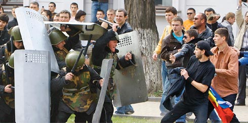 Илья Барабанов: «Революцию в Молдавии начали мирные и неравнодушные, а закончили злобные и необузданные» — так начинался репортаж корреспондента The New Times из Кишинева год назад. 7 апреля около 5 тыс. человек собрались на митинг оппозиции, главным образом молодежь — студенты кишиневских вузов и лицеисты. В толпе были и известные молдавские политики: Влад Филат (ныне премьер-министр страны), Кирилл Лучинский (сын бывшего президента), Дорин Киртоакэ (и тогда и сейчас мэр Кишинева). Студенты сожгли флаг Партии коммунистов. Казалось — этим все и закончится. Но ближе к полудню толпа вышла из-под контроля, в руках у молодых людей появились камни и бутылки, которые полетели в полицейских, в окна здания администрации президента. Полиция ответила водометами и слезоточивым газом. Толпа — массой: на площади уже около 10 тыс. человек. Политики и активисты инициативной группы «Я — антикоммунист» пытались оттянуть людей на другую площадь, где шел параллельный митинг — там выступала и Наталья Морарь. Часть людей ушла, но боїльшая втянулась в погром: они прорвались в здание администрации президента, вывесили над входом плакат «Румыния — родина моя», на крыше — флаги Румынии и Евросоюза, прорвались в расположенное напротив АП здание парламента. Полиция уже не сопротивлялась, молодые люди активно грабили здание парламента, выносили все — от кофеварок до компьютеров. К вечеру в парламенте начался пожар. Лишь после полуночи полиция взяла площадь под контроль. Задержаны 193 человека. МВД Молдавии сообщило, что пострадали 96 полицейских — 43 госпитализированы.