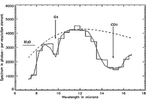 «Дарвин» задумывался как космический интерферометр из нескольких инфракрасных телескопов, аналогичных уже запущенному «Гершелю». Проект основан на методе интерферометрического зануления света звезды. Если несколько таких телескопов, расположенных в десятках метров друг от друга, могут управляться с микронной точностью с помощью микродвигателей, можно добиться того, что свет от выбранной звезды будет почти полностью занулен, а свет планет, обращающихся вокруг нее, — нет. Самое важное — то, что при этом можно снять спектр планеты в инфракрасном диапазоне, и этот спектр может сказать о многом. На рис. 4 — расчетный спектр Земли, как он был бы снят «Дарвином» с расстояния 10 парсек за 100 часов. Прекрасно видны молекулярные полосы поглощения CO2, воды и, главное, озона. Такое количество озона (соответственно кислорода вообще) может быть, только если на планете есть жизнь. Дело в том, что кислород — очень активный элемент, он должен быть химически связан. Небольшое количество кислорода могут давать космические лучи, разбивая молекулы CO2 или воды. Но большое количество кислорода в атмосфере однозначно говорит о том, что на планете идет мощный неравновесный процесс. Нам известен только один такой процесс — жизнь.