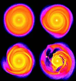 Второй радикальный переворот в представлениях пришел с пониманием того, что протопланетный диск вовсе не обязательно должен быть столь же идеален, как кольца Сатурна. Он может быть кривым (это наблюдают), он может быть неоднородным по азимутальному углу и даже иметь спиральные рукава, подобные галактическим. Алан Босс (Институт Карнеги, США) в 1997 г. с помощью численного моделирования выявил образование спиральных рукавов в протопланетном диске и их уплотнение до той стадии, когда должна начаться гравитационная неустойчивость — прямой и быстрый коллапс больших облаков газа в планеты-гиганты без всяких твердых зародышей. Впоследствии численное моделирование провели с лучшим разрешением, что позволило проследить процесс дальше. Некое представление о нем дает рис. 3, где показана эволюция диска за очень короткий промежуток времени — буквально за несколько орбитальных периодов. Видно также, что скорость процесса очень сильно зависит от плотности диска: изменение на 10% радикально меняет картину. Итак, неустойчивость развивается мгновенно по астрономическим масштабам, и планеты-гиганты рождаются сразу многочисленными выводками, как видно из нижней правой картинки.