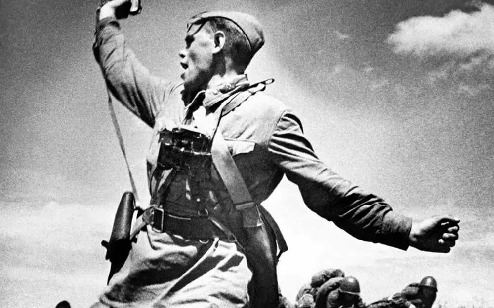 Молодой офицер Красной армии поднимает солдат в атаку. Через несколько мгновений он будет убит.