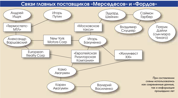 Здесь важно отметить, что учрежденное в 1995 году «Московское такси» находилось по тому же адресу (ул. Верхняя Радищевская, д. 16), где располагались многие компании Александра Варшавского, Игоря Бакуненко и Камо Авагумяна — «Европейская Риэлторская Компания», «Жилинвест XXI», ЗАО «Нью-Йорк Моторс-Москва». Там же была зарегистрирована фирма «Баджет — прокат автомобилей в Москве», членами совета директоров которой являлись все те же Александр Варшавский и Игорь Бакуненко, сегодня контролирующие рынок продажи «Мерседесов» и «Фордов».
