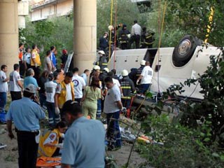 Крупное дорожно-транспортное происшествие с участием автобуса с российскими туристами произошло во вторник в Турции. Автобус упал в реку в районе курорта Антальи. По уточненным данным, в результате аварии погибли 15 человек, число пострадавших уточняется. Ранее сообщалось о 17 погибших и 24 раненых. Пресс-секретарь Российского союза туриндустрии (РСТ) Ирина Тюрина сообщила "Интерфаксу", что погибли 13 россиян и двое граждан Турции - гид и водитель. Четверо из размещенных в больницах россиян находятся в тяжелом состоянии. Всего в автобусе находился 41 человек: 39 российских туристов, гид-россиянин и турецкий водитель,