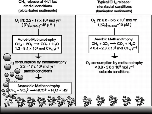 Из изученных вулканов излилось 50300 тыс. тонн нефтепродуктов. Т.е. по своим масштабам природная катастрофа во впадине Санта-Барбара была сопоставима с катастрофой буровой платформы Deepwater horizon в Мексиканском заливе. Возраст вулканов определен радиоуглеродным методом в 31-44 тыс. лет. Ранее было известно, что ~44 тыс. лет назад в заливе Санта-Барбара произошла резкая смена условий с аэробных на анаэробные (рис. 2) [5], однако причина такой смены не была очевидной. Данные, приведенные в статье [4], опубликованной в Nature Geoscience, позволяют говорить о том, что это было связано именно с извержениями асфальтовых вулканов.