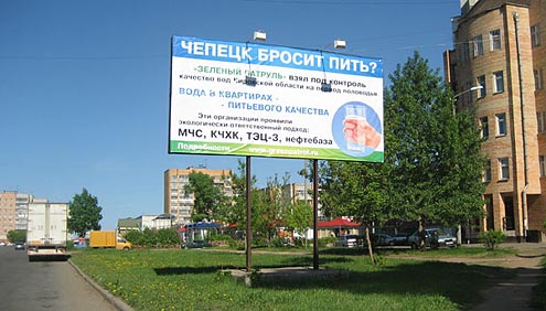 После завершения работы группы по наблюдению за паводком в Кирово-Чепецке появились рекламные щиты с фразами «вода в квартирах — питьевого качества». Вообще-то в Кирово-Чепецке и не было угрозы загрязнения водопроводной воды, так как водозабор находится выше шламонакопителей. А попробовал бы «Зелёный патруль» разместить такую рекламу в Кирове…