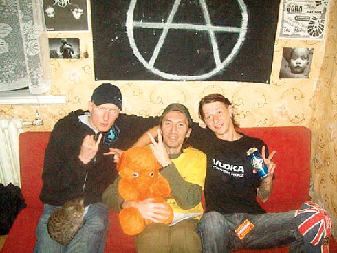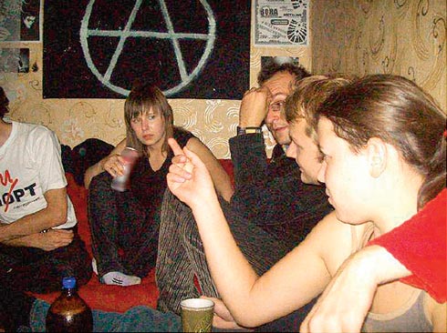 У сквоттеров 80–90-х было не принято ограничивать себя в удовольствиях, но в современных условиях приходится быть осторожным. «Наркотики не принимаем, — говорит Синяк, — даже травку не курим. По поводу бухла жесткое правило: не больше стакана водки в день на человека. Не дай бог, кто-то напьется, набедокурит, а нас накроют». Анархическая община вышла из тусовки неформалов на Старом Арбате. «Хотя у нас не только неформалы, есть даже бывший опер, — рассказывает Синяк. — Ушел из ментуры, не выдержал тамошних порядков. Из общаги его тоже выгнали. Познакомились на Арбате. Теперь вот он с нами». Жизнь у общины в бытовом смысле тяжелая. Вечно сырое помещение, разделенное на четыре комнаты, два дивана на всех, найденные на городских свалках, три кресла. Часть общины ночью спит в коробках. При этом анархисты принципиально не обращаются ни к каким государственным структурам — даже скорую помощь в случае чего не вызывают. «Ни рубля государству», — смеется Синяк и добавляет: «У нас чикса (девушка. — The New Times) есть с медицинским образованием, она кого хочешь вылечит». Друг Синяка Андрей по кличке Зеленый (в этот цвет выкрашены его волосы) говорит: «Бесит, когда нас называют маргиналами или бомжами. У нас у всех есть место жительства, документы, но мы принципиально обитаем здесь — среди братьев нам лучше. По большому счету при нынешней политической системе люди, стремящиеся к свободе, — изгои. Вот мы и объединяемся». На одной из стен Зеленый повесил флаг анархии с надписью Punk not dead, выдающий идеологию общины. Периодически ее члены участвуют в анархических, экологических и антифашистских акциях, сам Зеленый официально состоит в движении «Антифа». На вид ему под сорок, он самый старший, а потому в авторитете: его слово в сквоте всегда последнее. «Отличие нынешних сквотов в более строгих правилах, — продолжает он. — Раньше как было? Приводи кого хочешь, бухай сколько хочешь. Сейчас и без того сквот больше полугода просуществовать не может, и это в лучшем случае. Мы отлично понимаем, что рано или поздно нас разгонят. Бизнес прибирает все к рукам. Говорят, скоро за ВВЦ возьмутся».