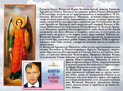 Участникам детской Таврической ассамблеи, которая прошла в одноименном дворце Санкт-Петербурга в День защиты детей, 1 июня, помимо книг по истории России вручили памятный сувенир — брошюру с молитвой за президента Российской Федерации. Набожные дети смогли узнать из нее, что президент в России двуедин. Во всяком случае авторы молитвы, обращаясь к Господу, просят его: «пошли, Господи, Архангела Твоего Михаила на помощь рабам Своим Димитрию и Владимиру». Функционал архангела Михаила описан в брошюре достаточно подробно: ему предлагается сокрушить всех врагов президента(ов). «Буди им Великий помощник, во всех обидах, в скорбях, печалях, в пустынях, на распутиях», — инструктируют архангела авторы молитвы. Михаилу предстоит также оградить дуумвират «от всякия прелести дьявольския», в чем можно увидеть намек на наметившиеся в тандеме противоречия накануне 2012 года. Если развивать христианское учение о триединстве Бога применительно к современным российским реалиям, то кто в России Бог-Отец, а кто Бог-Сын — в принципе понятно. Куда же в процессе выстраивания вертикали власти отсеялся Бог-Святой Дух, авторы молитвы за президента не уточняют. Зато юным читателям наглядно дали понять, что может случиться с дуумвиратом в том случае, если дети не будут усердствовать в молитвах за рабов Димитрия и Владимира. На задней обложке подарочной брошюры изображен последний российский император, царь-великомученик Николай II.