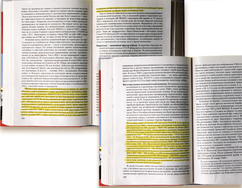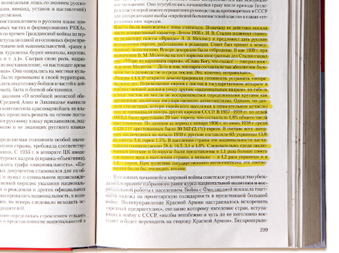 «Это первый в нашей стране учебник, где старательно подсчитываются доли евреев во власти, среди деятелей науки и культуры, а также их пропорциональное соотношение с общей численностью населения России, — говорит Анатолий Голубовский. — Авторы уделяют чересчур много внимания национальному вопросу в 30-е годы: тогда в госаппарате, в НКВД, в прессе вдруг оказалось много евреев. Вот как говорится об этом в учебнике: «...Такое фактическое неравенство стало восприниматься как ненормальное положение. Власть была вынуждена с этим считаться. Сталин позвонил Мехлису, в то время главреду «Правды», и предложил дать русские псевдонимы еврейским журналистам, а еще сказал Молотову: «Убери из наркомата евреев». Лидеры СССР открыто демонстрировали готовность устранить «неправильности». В определенных кругах эти действия воспринимались как проявления политики государственного антисемитизма... Однако, по данным статистики (во время репрессий. — The Nеw Times), потери еврейского населения в относительном исчислении не превышали потерь других народов СССР... При политике государственного антисемитизма эти соотношения были бы очевидно иными».
