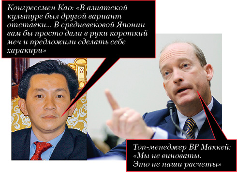 Зрелище было бы смешным, если бы не было таким грустным: Ламар Маккей, глава американского подразделения BP, cидел перед членами комиссии Конгресса США, расследующей причины аварии, с растерянным видом и повторял одну и ту же фразу, будто выученную наизусть: «Мы не виноваты. Это не наши расчеты». Намек на то, что виноваты партнеры из компании Deepwater Horizon, поставившие BP злополучную плавучую платформу. Конгрессмен-республиканец Клифф Стирнс предложил Маккею уйти в отставку, а пока — публично извиниться перед американцами. Но тот опять: «Это не наши расчеты». Тогда слово взял конгрессмен от штата Луизиана Ань «Джозеф» Као, у которого вьетнамские корни: «В азиатской культуре был другой вариант отставки... В средневековой Японии вам бы просто дали в руки короткий меч и предложили сделать себе харакири». После чего Маккей промямлил наконец: «Есть хорошие шансы, что к середине августа мы полностью возьмем ситуацию под контроль». «Середина августа»?!