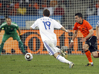 На 84-й минуте голландцы молниеносно разыграли назначенный у центральной линии штрафной. Пока недовольный защитник словаков еще дискутировал с арбитром, Дирк Кейт пробросил мяч мимо неуверенно сыгравшего на выходе голкипера и отдал передачу Снейдеру, который переправил его в сетку.
