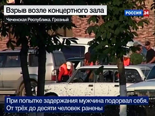 "В среду вечером находившиеся в районе театрально-концертного зала сотрудники милиции заметили молодого человека подозрительного поведения. При требовании остановиться и предъявить документы он предпринял попытку отбежать. При попытке задержания с целью проверки документов он совершил подрыв. Три человека пострадали", - сказал Кадыров. Подорвавший себя молодой человек погиб, принимаются меры с целью его опознания.