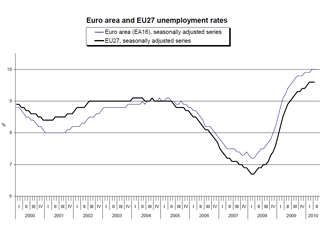 Уровень безработицы в еврозоне в мае этого года составил 10,0%, что соответствует пересмотренному апрельскому значению, сообщает пресс-служба агентства Eurostat.