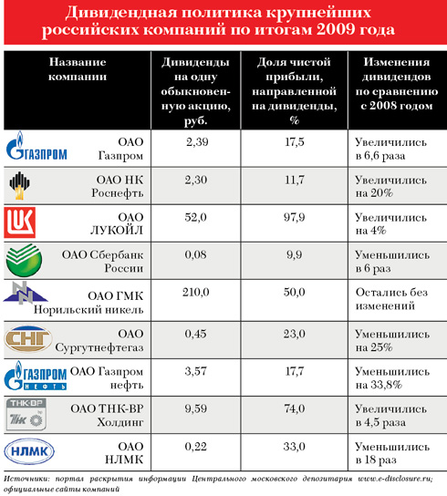 Миноритарным акционерам двух крупнейших российских банков — Сбербанка и ВТБ — на дивидендах разбогатеть пока также не удается. Председатель правления Сбербанка Герман Греф объявил на годовом собрании, что Сбер не собирается в ближайшее время тратить на дивиденды более 10% прибыли. По его словам, банку требуются «громадные инвестиции», на них и пойдет вся прибыль. В результате за одну обыкновенную акцию Сбера заплатят 8 копеек, за привилегированную — 45 копеек. Получается, что при чистой прибыли за 2009 год 21,7 млрд рублей объем дивидендных выплат составит лишь 2,18 млрд рублей.