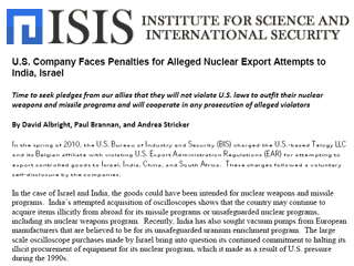 В докладе ISIS пишется, что Израиль и Индия приобретают запрещенные товары и технологии двойного назначения в США, действуя "ничуть не лучше, чем Иран или КНДР". Организация призывает власти США принять меры против этих стран, чтобы положить конец нарушению правил экспорта.