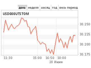 Средневзвешенный курс доллара США к российскому рублю со сроком расчетов "завтра" на торгах единой торговой сессии ММВБ по состоянию на 11:30 по московскому времени, на основе которого происходит процесс курсообразования доллара на следующий день, понизился на 3,25 копейки и составил 30,2066 рубля, передает "Финмаркет".