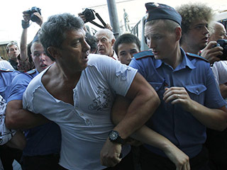 Лидер Левого фронта Сергей Удальцов приковал себя наручниками к зданию. Сотрудники милиции его отцепили.