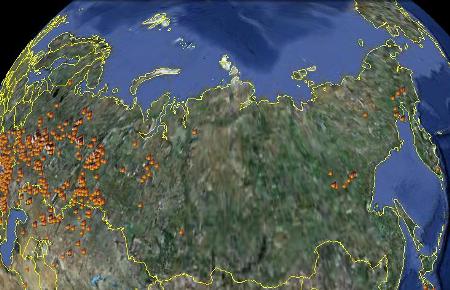Схема мест лесных пожаров на утро 11 августа 2010 года в России по данным пожарной информационной системы FIRMS. Пожары отражены внемасштабными знаками, поэтому схема дает представление о местах горения, но не о площади, охваченной огнем
