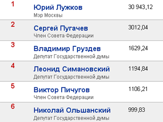 Однако семьям обоих вышеуказанных лиц далеко как от Земли до Луны до заработков супружеского союза мэра Москвы Юрия Лужкова и предпринимателя Елены Батуриной, возглавивших этот рейтинг. По подсчетам издания, семья столичного градоначальника заработала в минувшем году 30 миллиардов 943 миллиона рублей. Впрочем, сам мэр принес в семью чуть менее 8 млн рублей, отмечает издание.