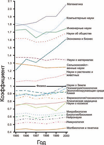 На рисунке видно, что абсолютные значения индекса Хирша для различных областей знания изменяются достаточно сильно как между различными областями знания, так и во времени. Тем не менее, грубо можно говорить, что хирш-индекс 20 в физике примерно соответствует хирш-индексу 10 в математике и 40 в иммунологии, молекулярной биологии и генетике. Все остальные области знания находятся между этими крайними значениями.