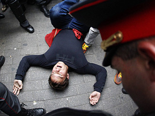 Эксперты объясняют это высказанным на днях премьером Путиным напутствием "отоваривать" митингующих "дубиной по башке". Милиционеры тащили принимавших участие в акции людей к автозаку, схватив за руки и ноги. Били головой об автобус, выкручивали руки. Применяли насилие даже к тем, кто не сопротивлялся. Политологи высказывают удивление недальновидностью властей, со страстью воюющих с оппозиционерами вместо того, чтобы решать серьезные проблемы, стоящие перед Россией.