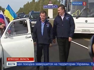 Медведев и Янукович подключились к автопробегу: оба на "Победах", хотя президенту Украины подобрали "ЛуАЗ"