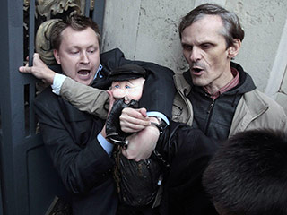 Гей-активисты успели выкрикнуть: "Лужков, гомик, с днем рождения!" - и потребовать расследования недавнего похищения Николая Алексеева, после чего дежурившие на площади милиционеры срезали наручники и затолкали протестующих в стоящие на площади автобусы.