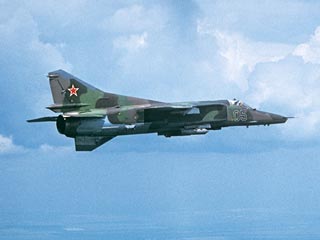 Миг-27 - советский сверхзвуковой истребитель-бомбардировщик с крылом изменяемой стреловидности. Предназначен для нанесения ударов по подвижным и неподвижным наземным и воздушным целям. Может нести тактическое ядерное оружие. Основной истребитель авиации Индии, Кубы и Казахстана.