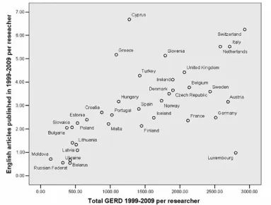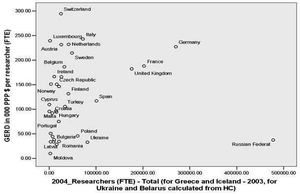 Рис. 1 представляет соотношение объема финансирования НИОКР в европейских странах в 1999-2009 гг. и число англоязычных статей, написанных учеными из них, в базе Scopus за тот же период [3]. Вообще говоря, он не содержит никаких поразительных откровений: страны выстраиваются более-менее по диагонали, указывающей на почти линейную связь между объемом финансирования и публикационной продуктивностью. Чем больше денег вложено, тем «видимее» национальная наука интернационально. При ближайшем рассмотрении, однако, выясняются некоторые дополнительные нюансы. Таблица 1 указывает «цену» статьи в тысячах евро. Россия оказывается на пятом месте, уступая только Люксембургу (расчеты для которого как для мини-государства в центре Шенгенской зоны в высшей степени проблематичны), Германии, Франции и Австрии и превосходя большую часть постсоциалистических стран в два и более раза. Общий объем финансирования можно представить как произведение двух переменных: числа исследователей и экономического обеспечения каждого из них. Рис. 2 показывает распределение стран в этом пространстве. Большая часть кажутся вытянутыми в одну линию вдоль левого края рисунка от наименее (Молдова, Латвия, Румыния) до наиболее (Швейцария, Италия, Люксембург) щедро, в пересчете на одного ученого, финансируемых. Основных отклонений в сторону большей численности четыре — богатые и многочисленные ученые Германии, Франции и Великобритании и бедные и многочисленные ученые России.