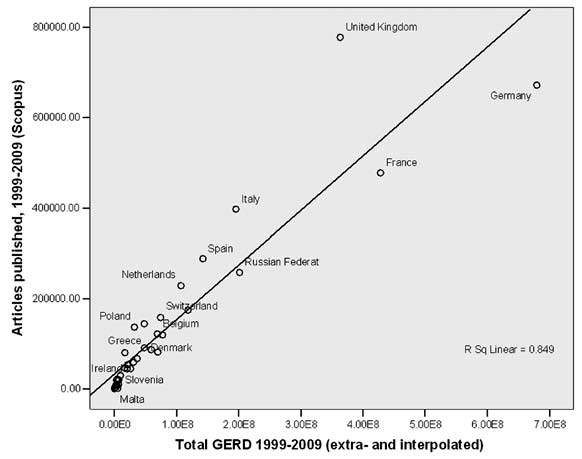 3. Данные были получены в рамках другого проекта (полный отчет о нем – www.cogita.ru/dokumenty/Sokolov_Diaspora.pdf), поэтому важно оговорить, в каких отношениях они были отличны от использовавшихся В&М. Основных отличий было три: (1) использовался Scopus, а не Web of Science; (2) брались 1999-2009 гг., а не 1996-2005; (3) охвачены были все европейские страны, кроме микрогосударств (Сан-Марино, Андорра, Лихтенштейн). Хотя между двумя библиометрическими базами данных имеются ощутимые различия, легко показать, что ни одно из них не особенно существенно для целей сравнения, предпринятого в наших с В&М исследованиях. Аналогично, сдвиг на 3 года мало изменил общие тенденции. Однако выбор между европейскими странами и крупнейшими по численности национальными науками, которые использовали В&М, как мы увидим далее, уже далеко не столь безобиден. Менее важное отличие — В&М считали, видимо, все публикации в базе, я — только тексты на английском языке. Однако поскольку англоязычные статьи составляют более 95 % всех представленных в любом из индексов (см. цифры далее, таблица 2 для WS), эта разница в стратегии не могла дать существенных расхождений в результатах. Наконец, я брал только тексты, квалифицируемые как статьи, — сообщение В&М не упоминает, что в точности считали они. Все статистические данные о финансировании и численности ученых взяты из базы ЮНЕСКО (www.uis.unesco.org/evphp?ID=2867_201&ID2=DO_TOPIC). В тех случаях, когда информация по отдельному году отсутствовала (примерно 10% ячеек по избранным странам для периода 1999-2007 гг.), брались данные по ближайшему наличному году. Данные по 2008 и 2009 гг., статистика по которым пока не представлена, экстраполированы исходя из данных предыдущего десятилетия для всех 36 стран.