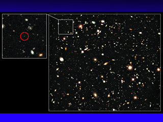 Каждый раз, рассматривая в телескоп далекие галактики, астрономы получают возможность заглянуть в прошлое Вселенной. UDFy-38135539 позволяет увидеть, какой была Вселенная в "возрасте" всего 600 млн лет - это лишь 4% от теперешнего времени ее существования, объясняет британская газета The Daily Mail.