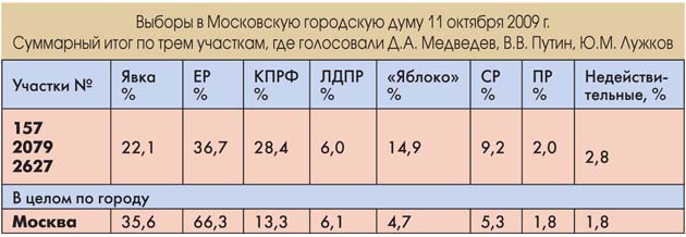 На трех участках, где голосовало руководство, манипуляции с подсчетом голосов по понятным причинам не допускались. Пресса, многочисленные наблюдатели, подчеркнутая корректность. Взятые для примера участки расположены в разных районах города — Раменки, Гагаринский, Тверской. Все они дают сходную картину, заметно отличающуюся от официальной среднемосковской. Особенно в части явки и поддержки «Единой России». Вплоть до того, что на участке, где проголосовал В.В. Путин, КПРФ, согласно официальным итогам, опередила «Единую Россию».