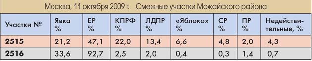 На участке № 2515 итоги правдоподобны, начиная от явки и кончая числом недействительных бюллетеней. К тому же они в общем напоминают цифры, зафиксированные на трех ранее упомянутых «элитных» участках, — с понятными расхождениями в поддержке «Единой России», ЛДПР и «Яблока». Про участок № 2516 такого не скажешь: «Единая Россия» — почти вдвое больше; КПРФ, «Яблоко» и «Справедливая Россия» — в 10 раз меньше. Хотя избиратели практически идентичны.