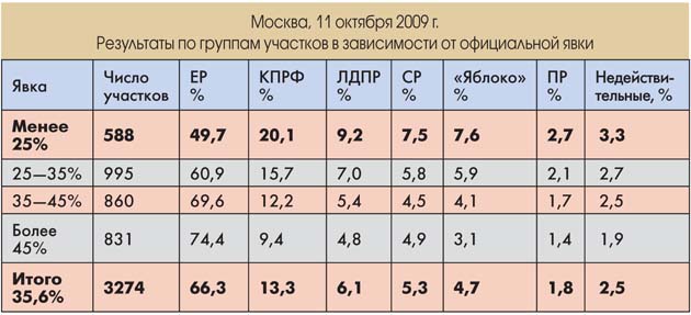 В нашем случае, очевидно, между 20 и 25% лежал реальный процент явки московских избирателей. То, что сверху, обеспечено почти целиком бюллетенями в пользу ЕР. Рост числа проголосовавших начиная с момента перелома идет параллельно с показателем поддержки партии власти. Логично: уж если «подтягивать» явку, то не пустыми бюллетенями, а с отметкой за кого надо.