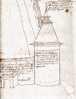 Стены и башни на Чертеже испещрены скорописными комментариями, ради чего, собственно, он и выполнялся. Комментарии свидетельствуют о текущем состоянии объектов. Из них следует, что башня имела тогда лишь мелкие повреждения кладки и обмазки.