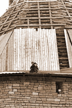 Идет работа – шатер растет. Насколько он будет долговечен, зависит от многих факторов – от того, насколько удастся просушить колоссальное сооружение, от тщательности работы и в большой степени – от правильной, грамотной эксплуатации башни. Ведь именно отсутствие мало-мальского ухода и адекватного использования и привело прежний шатер в аварийное состояние всего за 30 лет.