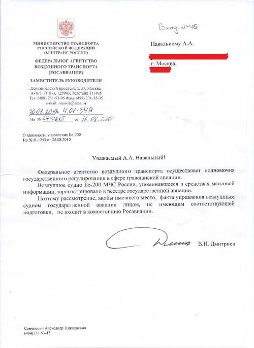 Юрист Алексей Навальный публикует в своем блоге ответы чиновников по поводу полетов Владимира Путина на самолете-амфибии Бе-200: