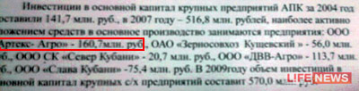 "Деньги на развитие сельского хозяйства выделяются из госбюджета в бюджет края, затем через "Россельхозбанк" распределяются по агрофирмам", - рассказал Life News руководитель Департамента сельского хозяйства Кущевского района Виктор Пикалов. Из документов видно, что поддержка "Артекс-Агро" занимала просто подавляющую часть от всего объема инвестиций в аграрный сектор района.