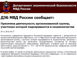 Департамент экономической безопасности (ДЭБ) МВД России сообщил в понедельник о пресечении деятельности группы, занимавшейся мошенничеством, связанным с вымогательством взяток при заключении госконтрактов на поставку дорогостоящего медоборудования. В преступную группу входили бывшие и действующие высокопоставленные чиновники.