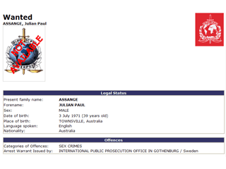 Международная организация уголовной полиции (Интерпол) по запросу прокуратуры Швеции во вторник объявила в международный розыск основателя сайта WikiLeaks Джулиана Ассанжа. В Швеции главу веб-ресурса, специализирующегося на скандальных разоблачениях, обвиняют в изнасиловании и сексуальных домогательствах.
