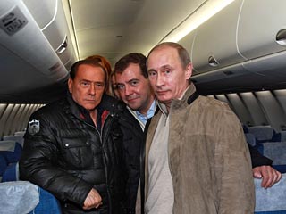 Как синхронно передают официальные российские информагентства, в частности, ИТАР-ТАСС, Медведев, Путин и Берлускони поднялись на борт самолета, который прилетел в Сочи в рамках испытаний из Якутска. Место капитана корабля занял Берлускони, место второго пилота - Медведев, а Путин находился рядом с местом бортпроводника. Лидеры обменивались впечатлениями о самолете и высказали общее мнение, что у "Суперджета" большое будущее, пишут агентства.