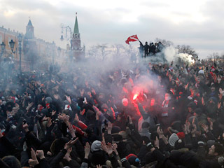 Чтобы предупредить возможные провокации, фанаты из "Фратрии" призвали своих последователей не принимать участие в других акциях. Тем не менее днем в субботу на Манежную площадь вышли около 5 тыс. молодых людей. Они зажигали файеры и скандировали националистические лозунги: "Русские, вперед!", "Е..ть Кавказ, е..ть", "А ну-ка, давай-ка, уе..вай отсюда, Россия для русских, Москва для москвичей!", "Москва - русский город!" и "За это убийство ответят ваши дети!".